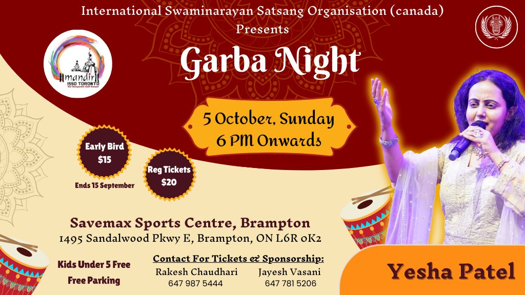 Join us for a vibrant night of Garba with Yesha Patel, hosted by the International Swaminarayan Satsang Organisation (Canada).